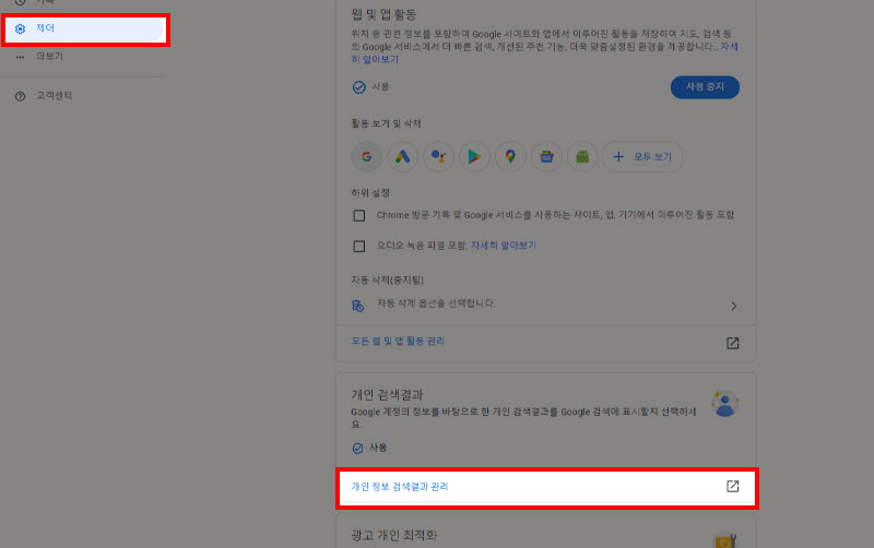 그럼 아까 구글 계정 관리에서는 보이지 않던 설정들이 보입니다. 어째서 따로 구분하여 설정하는지 모르겠지만 구글 검색기록 끄기를 해야 하기에 번거롭지만 진행해봅니다.