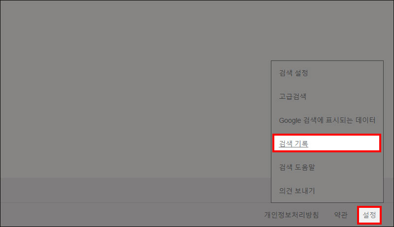 구글 첫화면 우측 하단에 있는 설정을 선택합니다. 그럼 예전에는 보이지 않던 '검색 기록' 메뉴가 추가된 것을 볼 수 있습니다. 이전에는 검색 활동이었는데 업데이트를 하면서 변경된 것 같습니다.