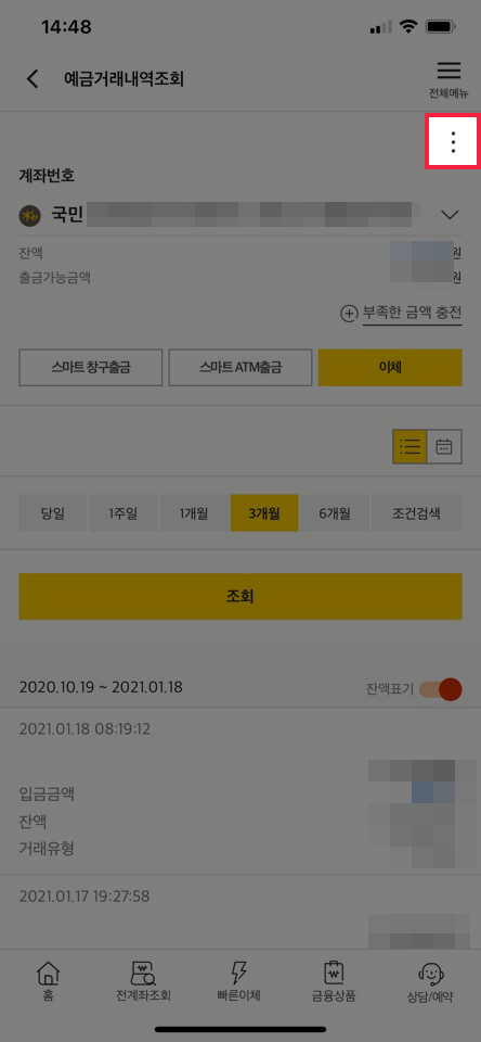 계좌를 선택하면 상세한 거래내역을 확인할 수 있습니다. 화면 위쪽에 보이는 계좌번호 정보를 주목해 주세요. 오른쪽에 보시면 세로로 점 세 개의 버튼이 보이는데 여길 선택합니다.