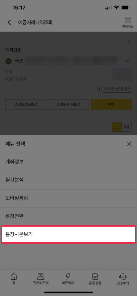그럼 해당 계좌에서 실행할 수 있는 다양한 메뉴가 보이는데, 여기서 통장사본보기를 터치합니다.