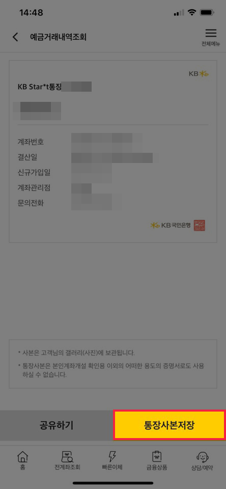아래의 노란색 버튼인 통장사본저장을 선택합니다. 그럼 여러분의 기기에 사진으로 통장사본 저장이 됩니다.