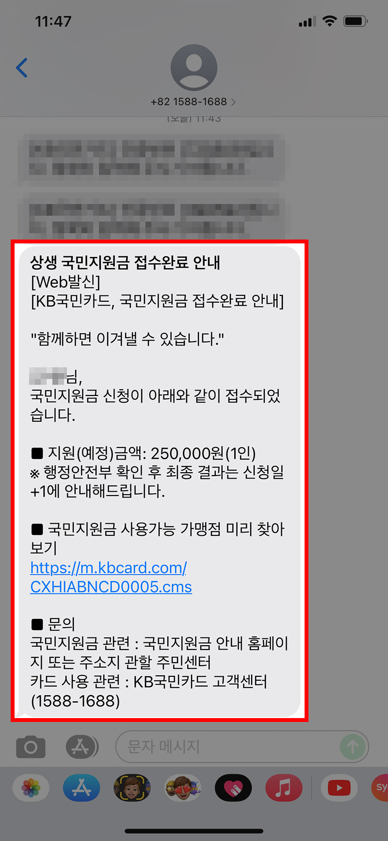 더 쉽게 잔액을 확인하는 방법은 문자입니다. 국민지원금 사용 가능 매장에서 결제를 하면 사용한 카드사에서 문자를 통해 사용 내역과 잔여 금액을 알려줍니다.
