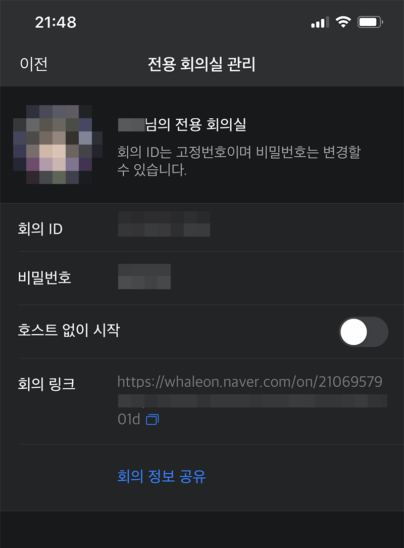 전용 회의실은 자신만의 고유한 회의 ID와 링크가 있습니다. 임시로 생성하는 회의가 아닌 화상 교육, 실시간 컨설팅 등 지속적으로 사용하는 경우 유용한 기능입니다.