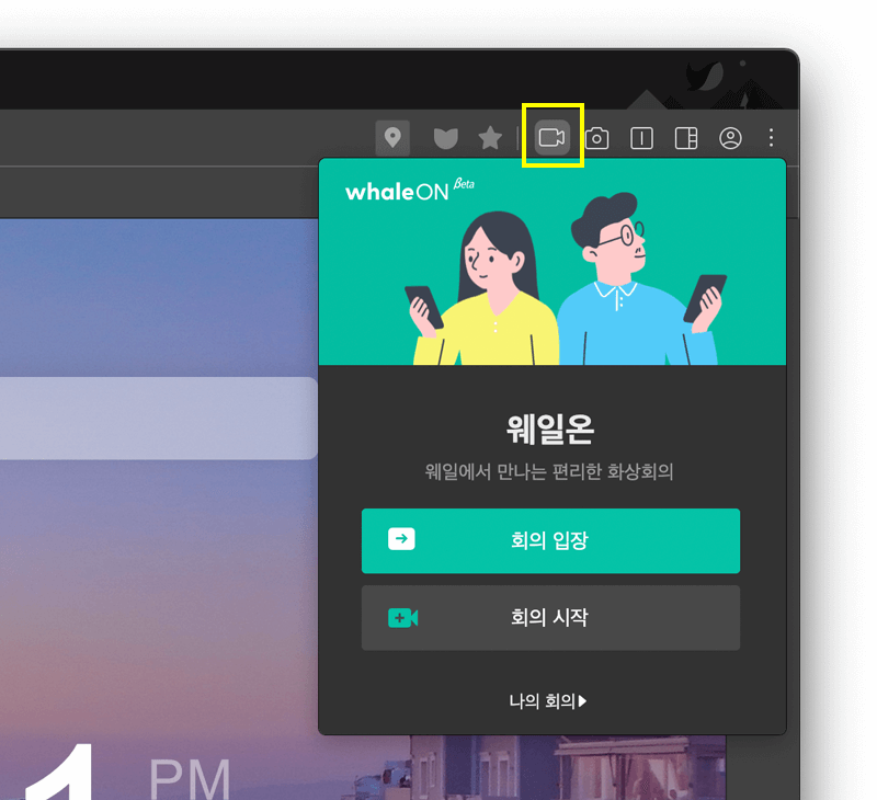 이 아이콘을 통해 웨일 온에 접속할 수 있습니다. 회의 입장을 클릭합니다.