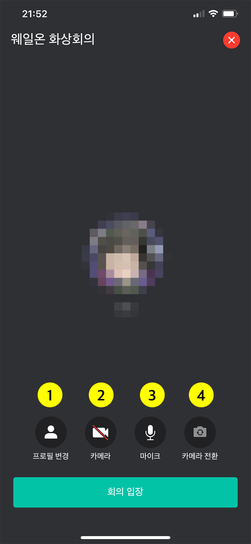 아래 이미지를 참고하셔서 4가지 항목을 확인해보신 뒤 이상이 없다면 회의실에 입장합니다.