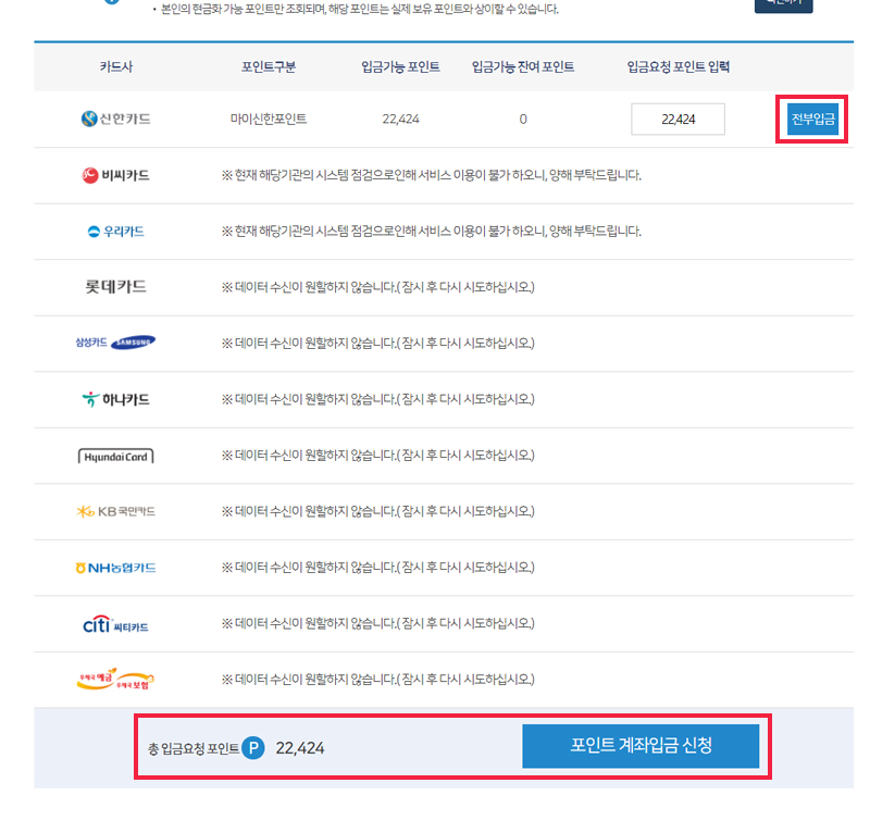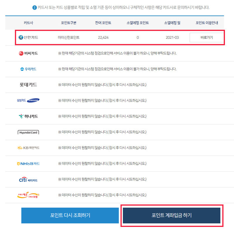 카드 포인트 통합조회 이용 시간 및 계좌입금 시간