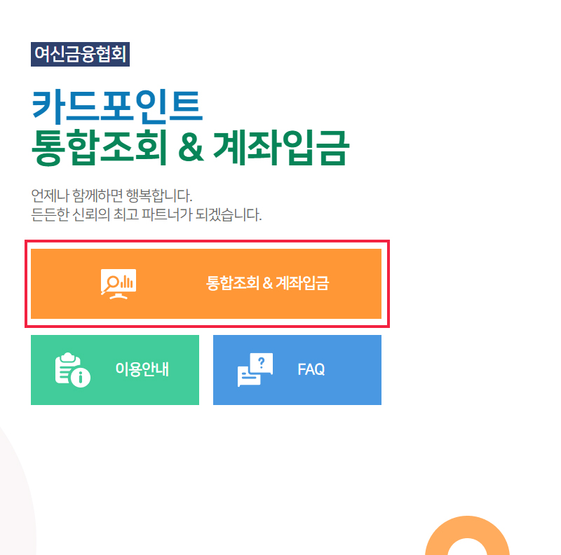 카드 포인트 조회를 위해 여신금융협회 홈페이지에 접속합니다. 그리고 메인 화면에 보이는 '통합조회&계좌입금' 메뉴를 선택합니다.