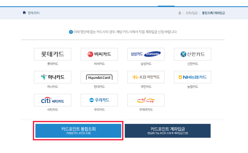 카드 포인트 통합조회를 제공하지 않는 카드사의 경우 직접 카드사에 문의하거나 별도의 절차를 통해 포인트 조회를 하실 수 있습니다.