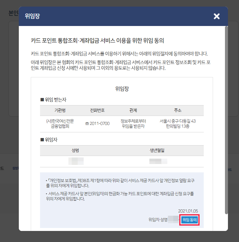 카드 포인트 통합조회를 하기 위해 위임 항목에 동의를 진행합니다. 아무래도 여러 카드사의 포인트를 한 번에 조회해야 하기 때문에 필요한 절차라고 생각됩니다.