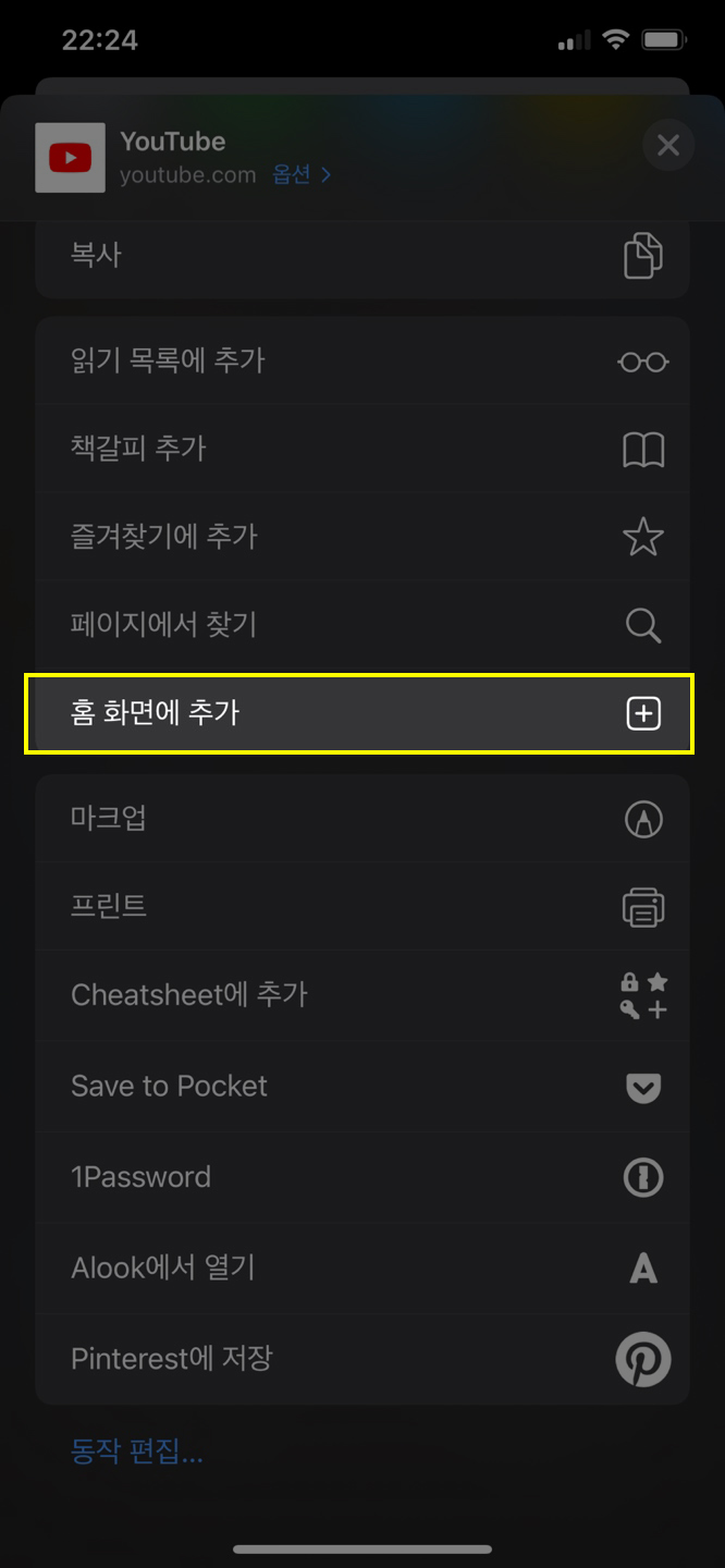 다양한 기능 중에서 화면을 아래로 내려서 홈 화면에 추가 메뉴를 선택합니다. 그럼 간단한 안내 메시지가 새로운 화면에 나오는데 추가 버튼을 누르면 아이폰 유튜브 바로가기 만들기가 완료됩니다.