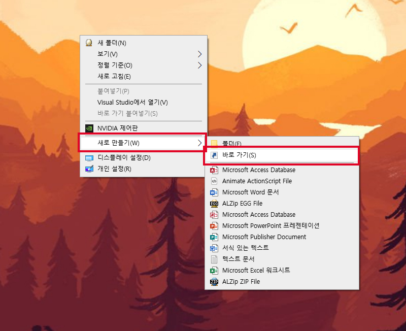 복사하기를 클릭하셨다면 이제 인터넷 창을 종료하거나 아래로 내린 뒤 컴퓨터 바탕화면으로 옵니다. 바탕화면에서 빈 곳 아무 곳에서나 마우스 오른쪽 버튼을 클릭합니다. 그리고 새로 만들기 - 바로 가기를 선택합니다.