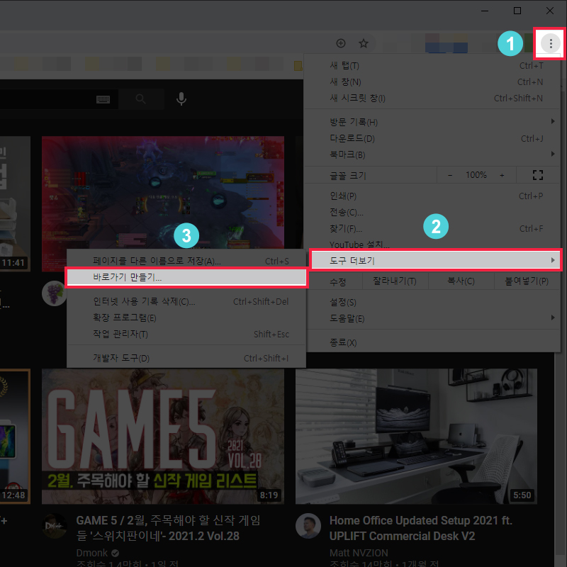 구글의 크롬 브라우저를 실행한 뒤 유튜브에 접속합니다. 그리고 오른쪽 위에 보이는 작은 점 세개를 클릭합니다. 그 뒤에 나오는 메뉴에서 도구 더보기를 선택하고 바로가기 만들기를 눌러줍니다.
