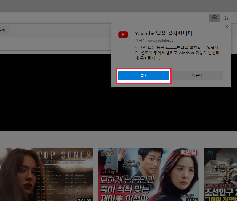 이 버튼을 클릭하면 윈도우에서 유튜브로 바로 접속할 수 있도록 만들어주는 앱이 설치됩니다. 설치 버튼을 선택합니다.