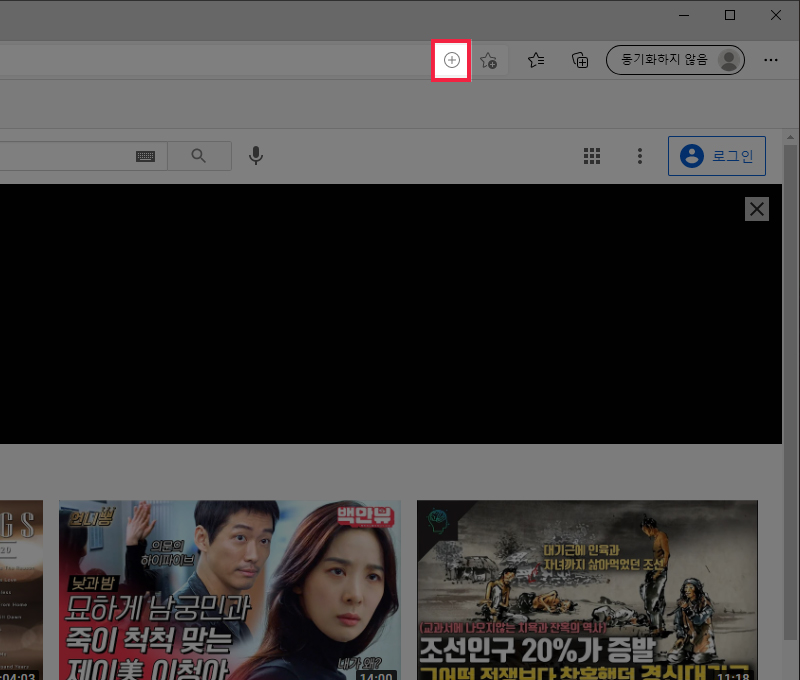 엣지에서는 크게 두 가지 방법으로 유튜브에 바로 접속할 수 있습니다. 우선 유튜브에 접속한 뒤 인터넷 주소창을 유심히 보면 더하기 모양의 버튼이 있습니다.