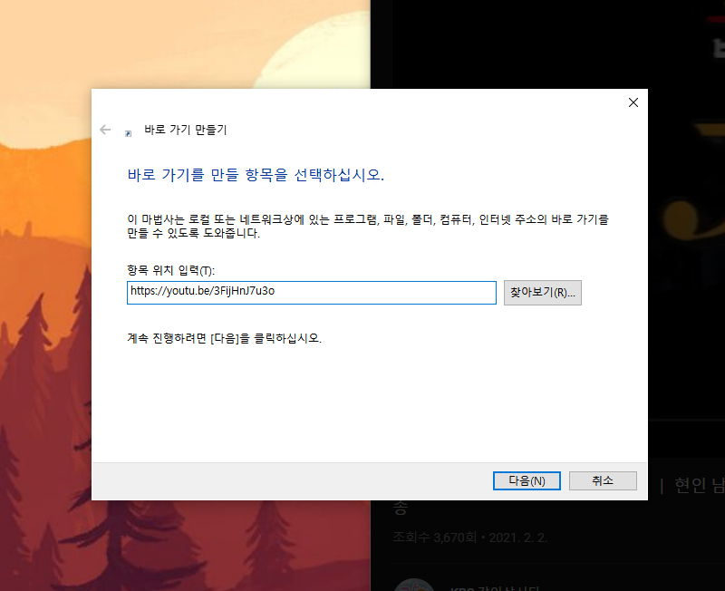 입력을 완료하면 다음과 같이 유튜브 바로가기 동영상이 바로 만들어집니다. 이제 해당 아이콘을 실행하면 유튜브에서 내가 즐겨보는 영상을 바로 실행할 수 있습니다.