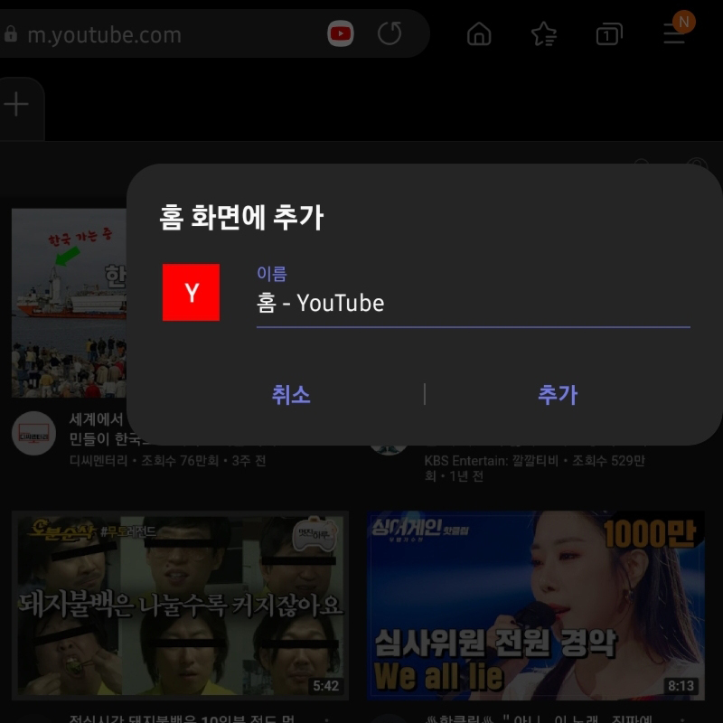 홈 화면에 추가할 이름을 설정하는 화면이 나오는데 여기서 이름을 수정하시거나 그대로 두신 뒤 추가 버튼을 눌러줍니다.