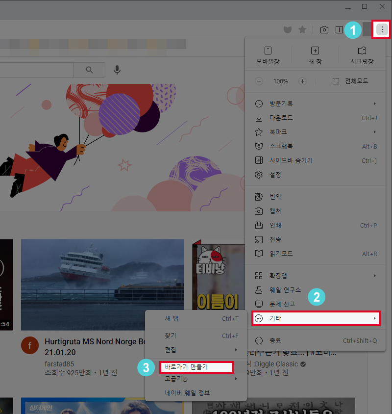 브라우저를 실행하고 유튜브에 접속합니다. 오른쪽 위에 있는 점 세 개의 아이콘을 선택합니다. 그리고 기타 메뉴에서 바로가기 만들기를 클릭합니다.