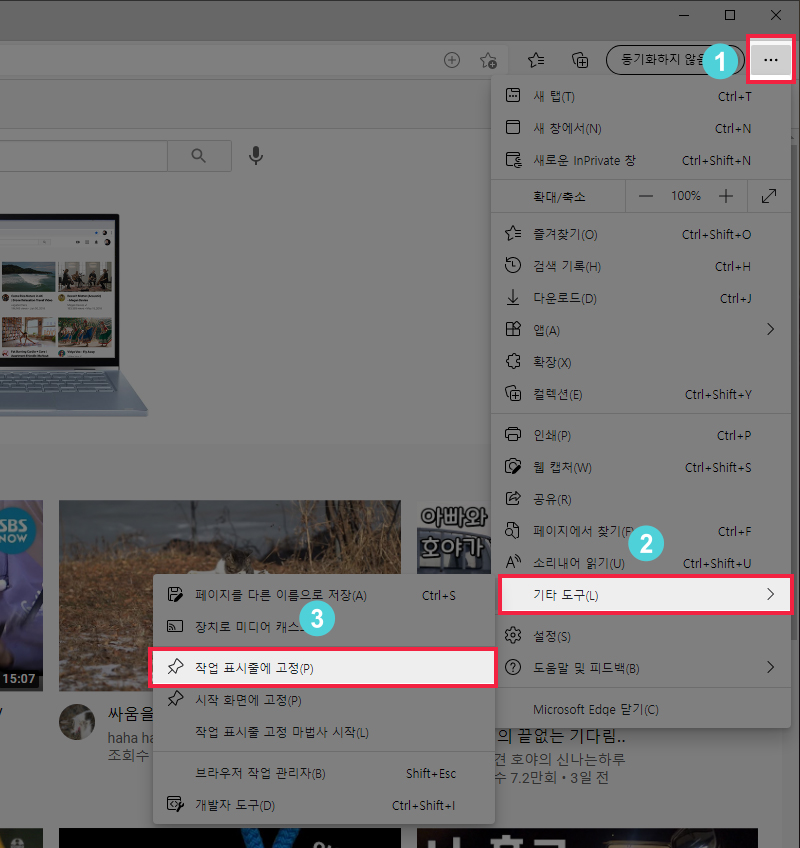 프로그램을 설치하는 것이 싫으신 분들은 작업 표시줄에 바로가기를 만들 수 있습니다. 아래의 이미지와 같이 순서대로 클릭을 하여 작업 표시줄에 고정시켜 줍니다.