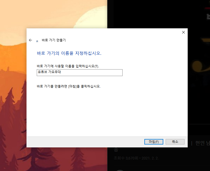 그리고 다음 버튼을 클릭하고 바로가기 이름을 작성해줍니다. 기왕이면 알기 쉽게 입력하는 것이 좋습니다.