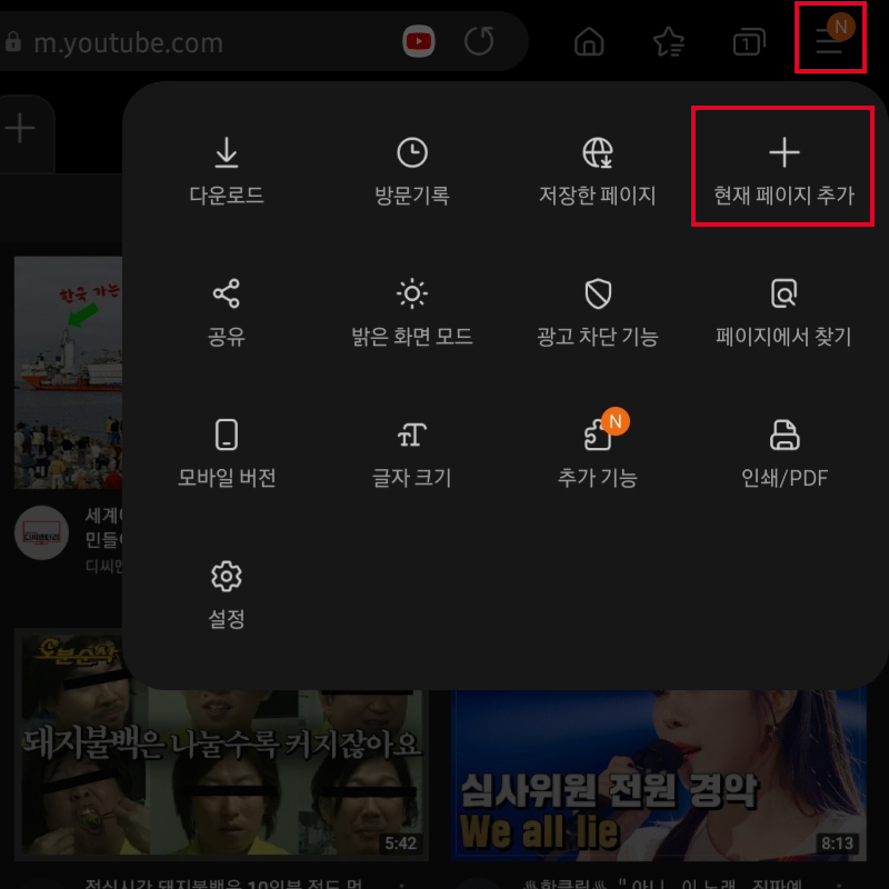 삼성 인터넷을 통해 유튜브에 접속합니다. 접속을 하였다면 오른쪽 위에 보이는 세 줄로 된 아이콘을 선택합니다. 그럼 다양한 메뉴가 나오는데 그중 현재 페이지 추가를 선택합니다.