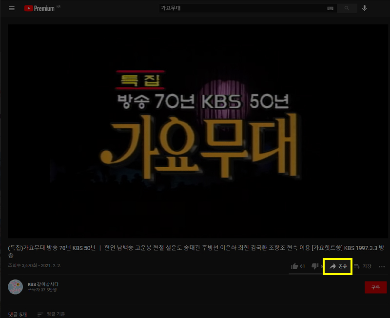 먼저 유튜브에서 바로가기로 만들 동영상을 선택합니다. 예를 들어 가요무대 동영상을 선택해보았습니다. 동영상이 재생되는 화면에 보시면 화면 하단에 공유 버튼이 보입니다. 공유 버튼을 선택합니다.
