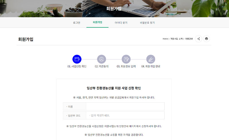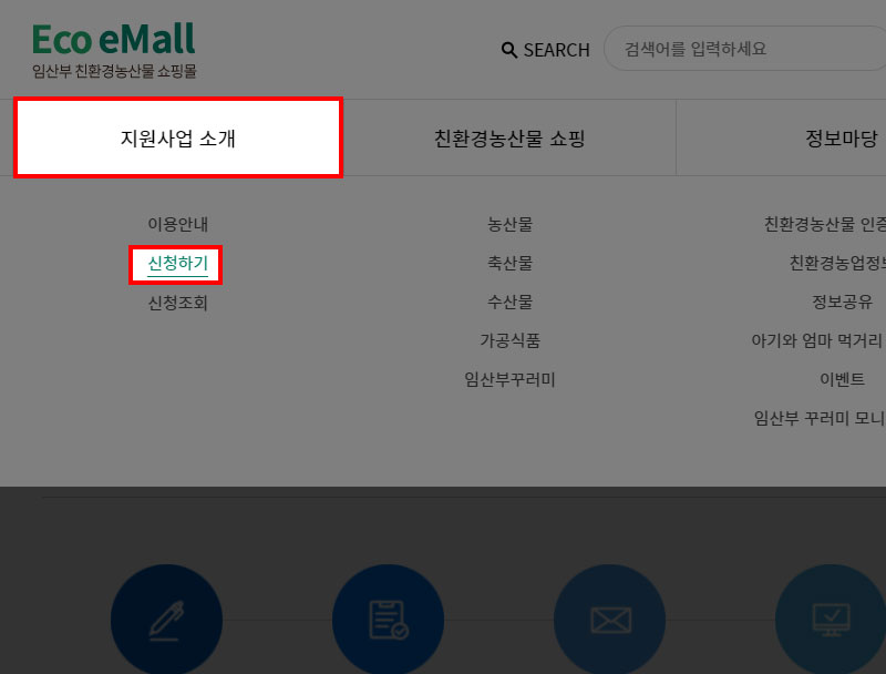 온라인 신청을 위해 임산부 친환경농산물 쇼핑몰(Eco eMall)에 접속합니다. 포털사이트에 '임산부 친환경농산물 쇼핑몰'이라고 검색하시거나 아래 바로가기 링크를 이용하시면 편리합니다.