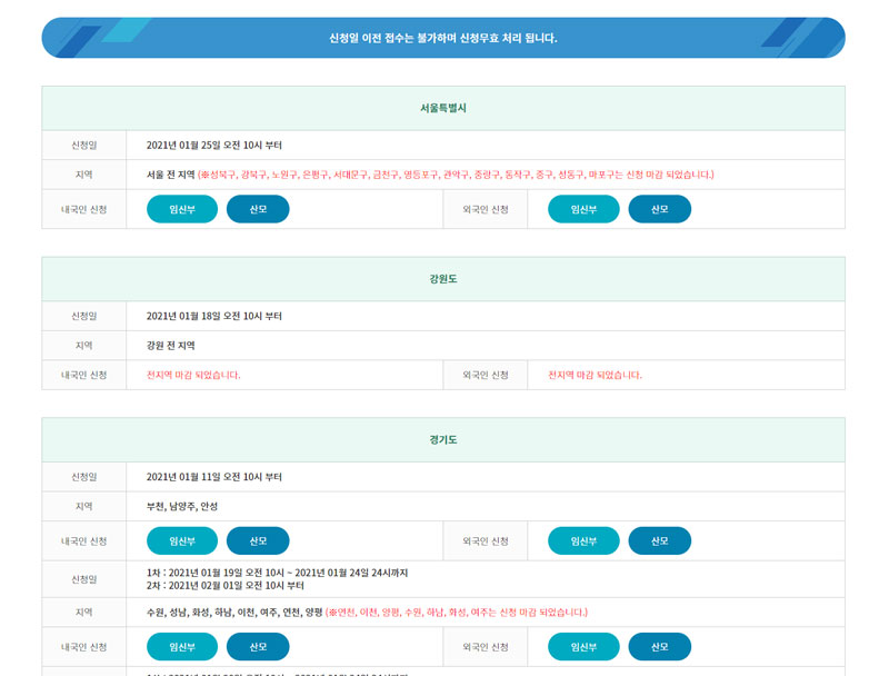 신청이 가능한 지역에 거주하고 계셔도 이미 신청 마감이 된 지역도 많기 때문에 직접 확인해보시는 것이 좋습니다. 아래 바로가기 링크를 통해 지역별 마감 현황을 확인해보세요.