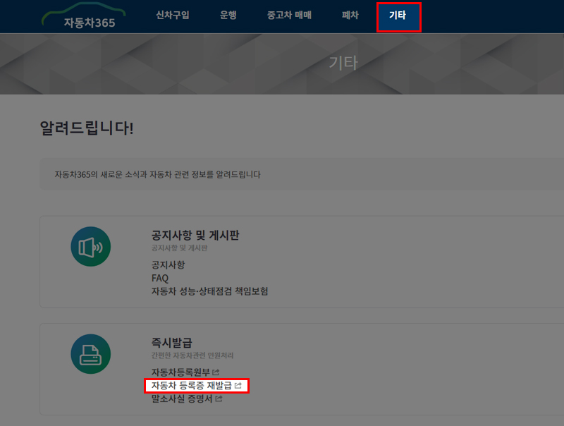 화면을 아래로 조금 내리면 즉시발급 메뉴에서 자동차등록증 재발급이라는 글자가 보입니다. 재발급 신청을 위해 클릭해주세요.