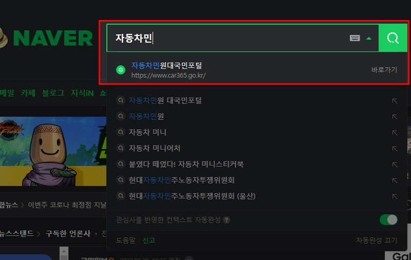 네이버 또는 다음과 같은 포털사이트에 자동차민원대국민포털을 검색합니다. 전체가 아닌 일부만 입력해도 쉽게 찾을 수 있습니다.