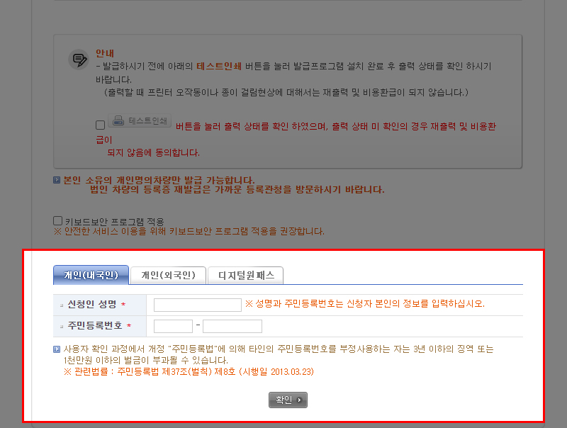 여기서 한가지 주의할 점은 재발급을 신청하기 전 테스트 인쇄를 진행하셔야 한다는 점입니다. 혹시나 프린터에 문제가 발생하거나 지원되지 않는 프린터를 사용할 경우 결제한 수수료에 대해 환급이 되지 않기 때문입니다.