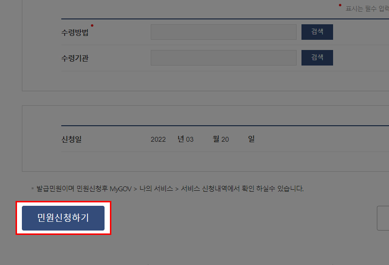 정상적으로 민원신청이 완료되면 최대 3시간 내에 처리가 완료되고 출력 또는 팩스를 통해 받아보실 수 있습니다.