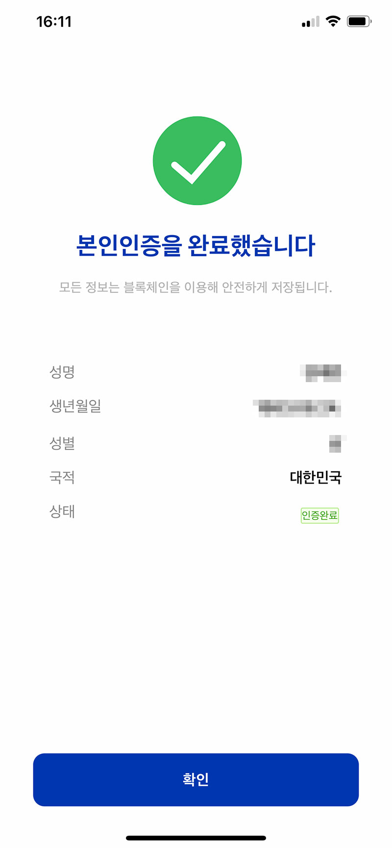본인인증을 하셨다면 확인 버튼을 선택해주세요. 개인 정보의 경우 블록체인 기술을 이용해 안전하게 저장된다고 하니 안심하셔도 될 것 같습니다.