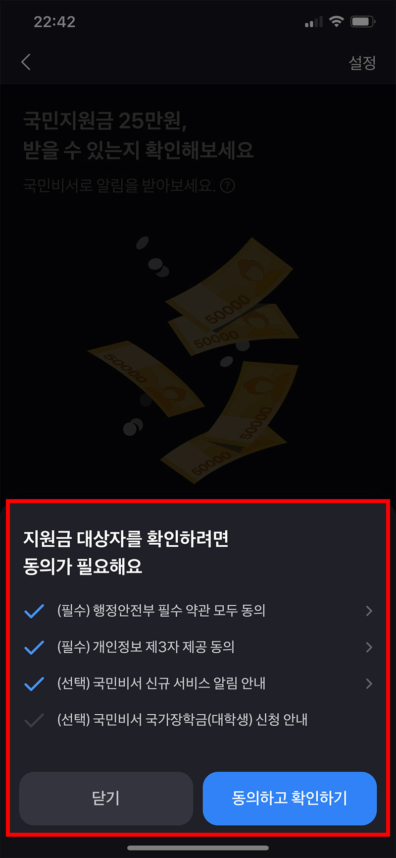 지원금 대상자 확인을 위한 간단한 동의 절차를 거치면 국민지원금 대상 여부 확인부터 지원금 신청하는 날까지 바로 확인할 수 있습니다.