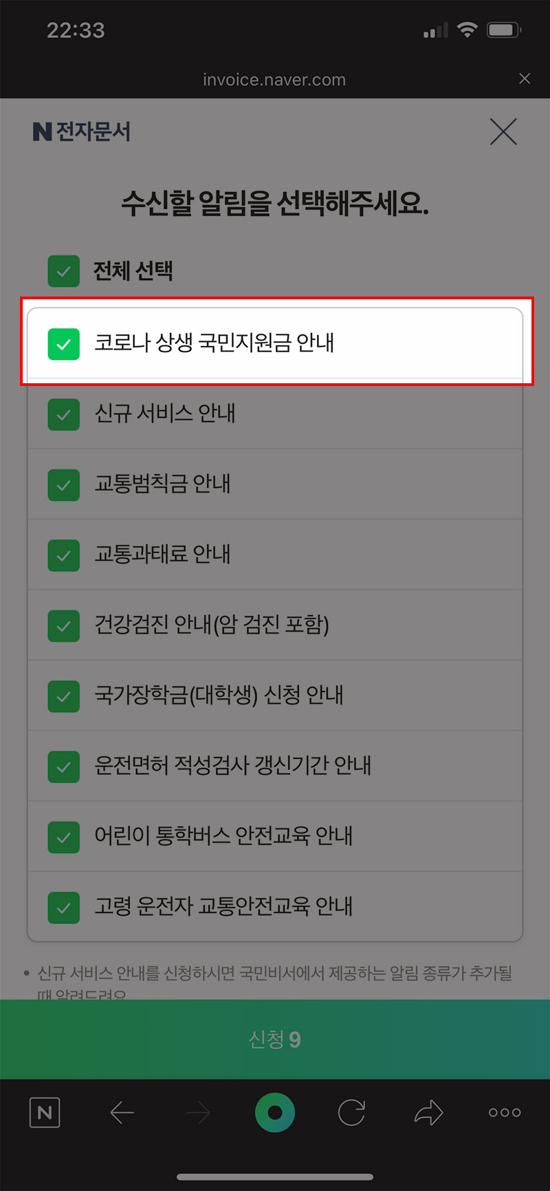 인증 단계까지 마무리 했다면, 수신할 알림을 선택해야 합니다. 당연히 코로나 상생 국민 지원금 안내는 필수로 선택하시고 나머지 정보는 필요하신 분만 체크하시고 하단의 신청 버튼을 선택합니다.