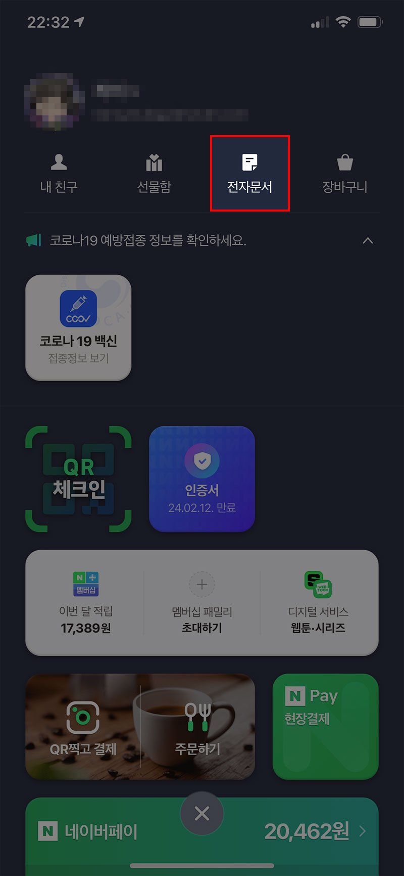 스마트폰에 설치된 네이버 앱을 실행합니다. 우측 상단의 프로필 이미지를 선택해주세요. 네이버에서 제공하는 다양한 서비스와 전자문서를 한 곳에서 관리할 수 있는 화면이 보입니다. 상단의 메뉴 중에서 전자문서를 선택합니다.