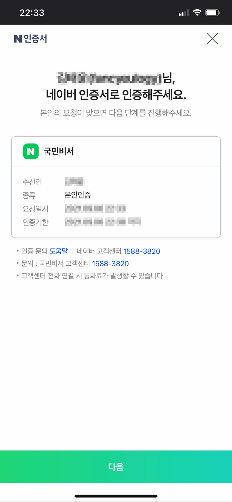 그럼 네이버 인증서를 통한 간단한 인증 단계를 거치게 됩니다. 미리 받아놓으신 인증서가 있다면 바로 다음 버튼을 선택해주시고, 아니시라면 아래 링크를 참고하여 네이버 인증서 발급을 진행해주세요.