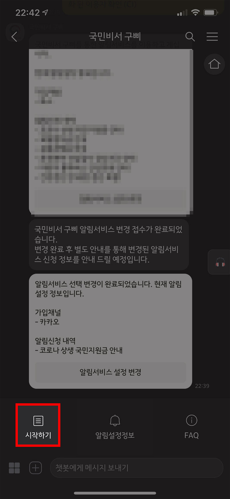 시작하기 버튼을 선택하면 구삐에서 보내는 카톡이 도착합니다. 메시지에서 안내하는 내용에 따라 선택하면 국민 지원금 대상자 조회 알림 신청이 완료됩니다.