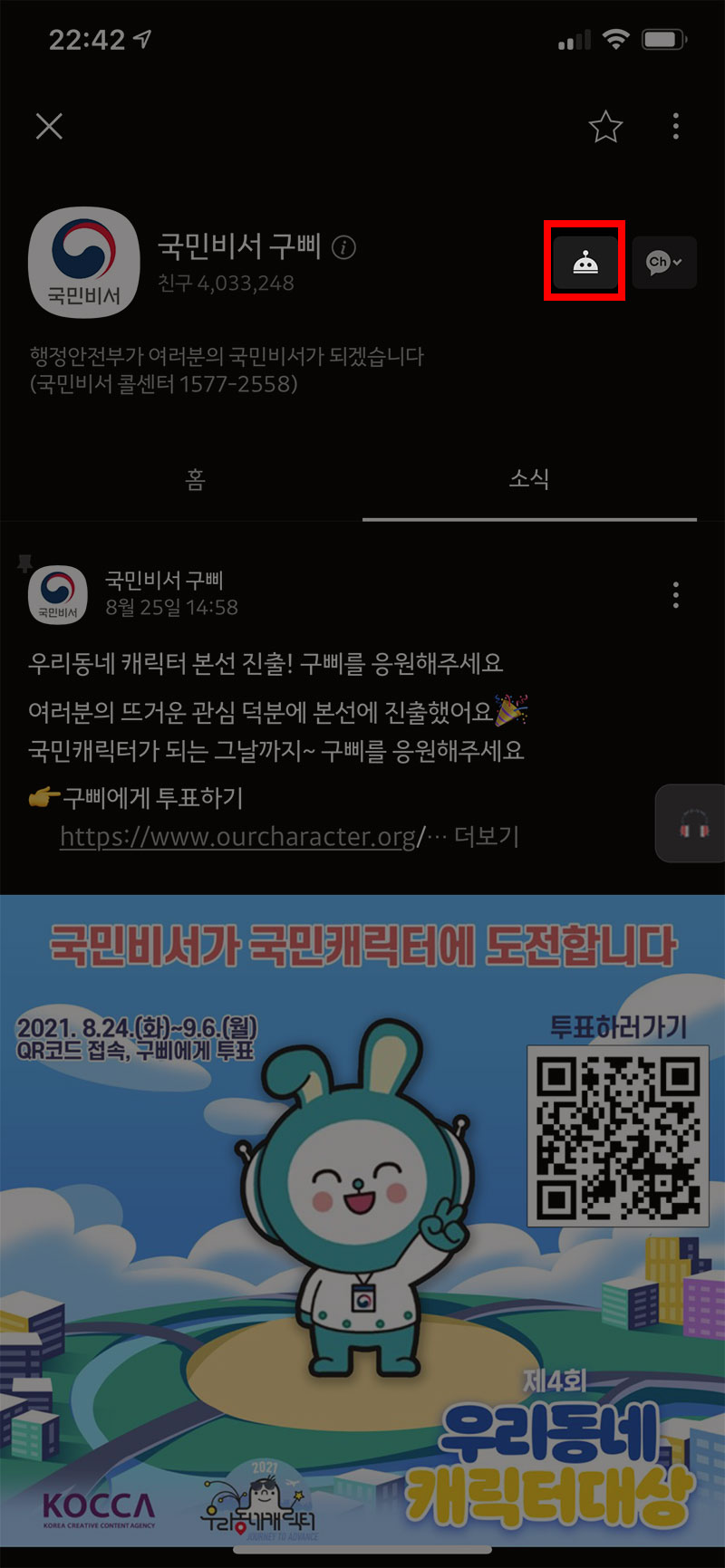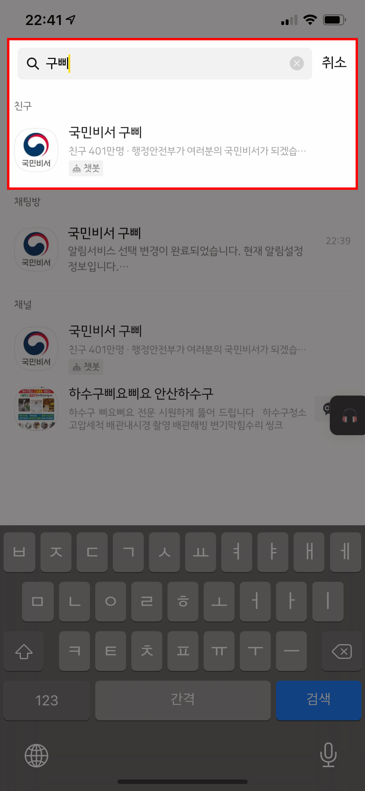 검색창에 구삐를 검색한 뒤 가장 위에 보이는 행정안전부가 운영하는 국민비서 구삐 채널을 선택합니다.