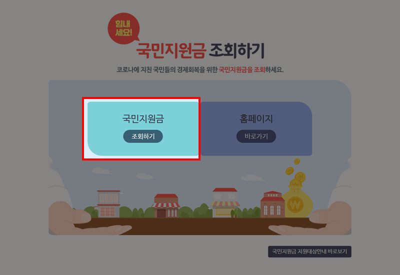 모바일 앱이 익숙하지 않거나 대상 여부를 빠르게 확인하고 싶으신 분들은 건강보험공단 홈페이지를 이용하시면 됩니다. 홈페이지에 접속을 하면 바로 국민 지원금 조회하기 메뉴를 확인할 수 있습니다.
