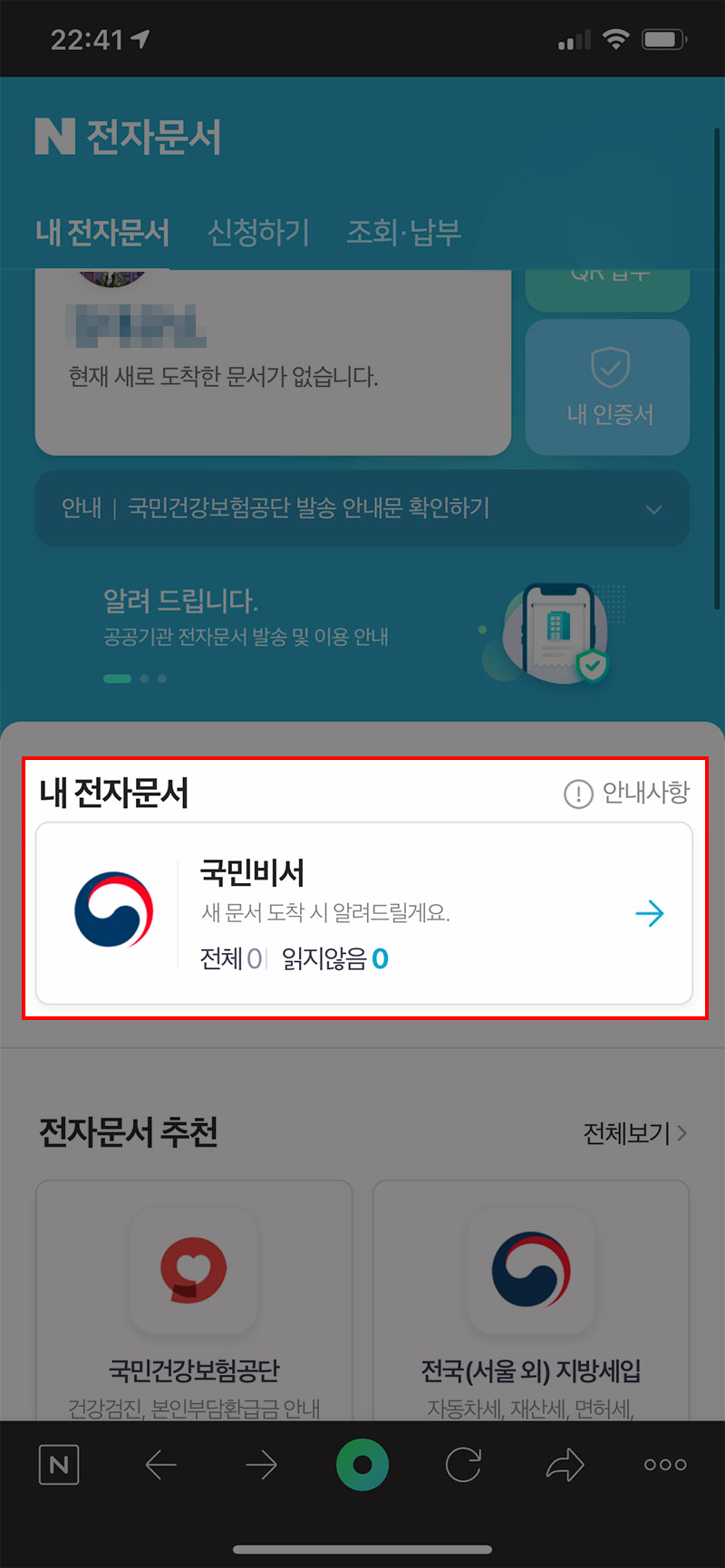 그럼 전자문서의 첫 화면에서 국민비서가 추가된 것을 확인할 수 있습니다. 만약 국민지원금 대상자라면 자신의 신청일에 알림을 통해 확인할 수 있습니다.
