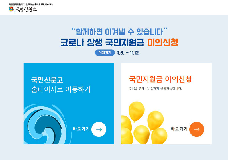 국민지원금 이의신청 또한 대상자 조회와 마찬가지로 온라인과 오프라인에서 모두 하실 수 있습니다. 온라인의 경우 국민신문고 사이트에 접속하시면 어렵지 않게 신청할 수 있습니다.
