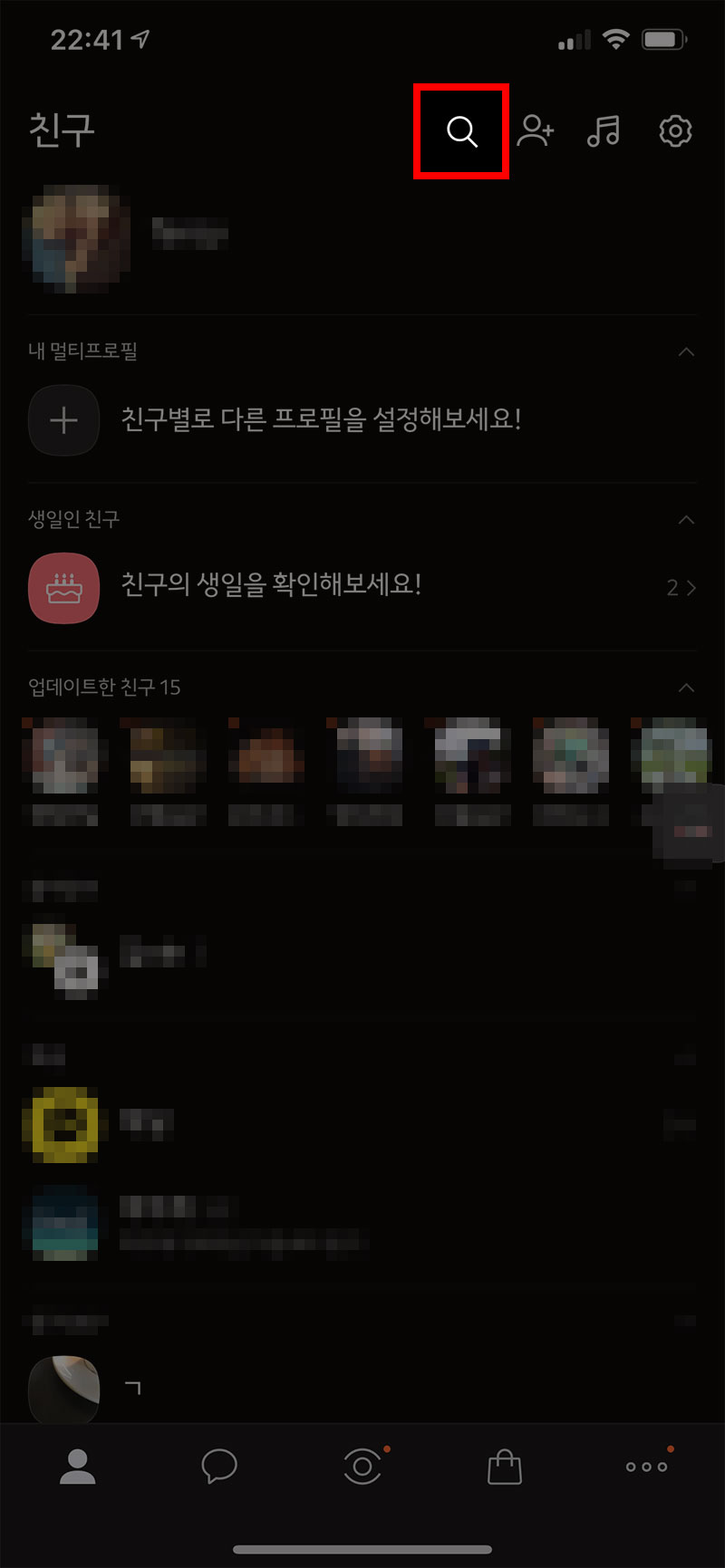 카톡에서 국민 지원금 대상 확인을 하는 방법은 네이버와 마찬가지로 국민비서 구삐를 활용합니다. 카카오톡 채널을 추가하면 되는데요. 카톡 친구 목록 화면에서 가장 위에 있는 돋보기 버튼을 눌러주세요.